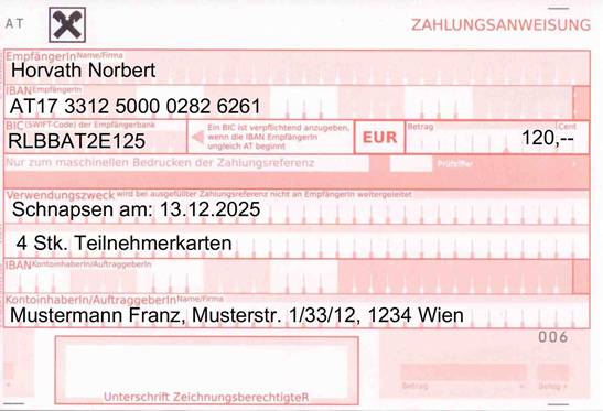 unter Einzahlung auf Konto IBAN: AT17 3312 5000 0282 6261 (RAIKA) werden deine Teilnahmekarten reserviert (Nennschluß für Bankeinzahlungen 03.12.2025. Mit der Zahlungsbestätigung erhältst du am Veranstaltungsort die Teilnehmerkarten. Bitte Veranstaltung, Datum und Anzahl angeben. (z.B. Preisschnapsen am 13.12.2025, 4 Teilnehmerkarten) Für Auslandsüberweisungen: IBAN: AT17 3312 5000 0282 6261 / BIC: RLBBAT2E125